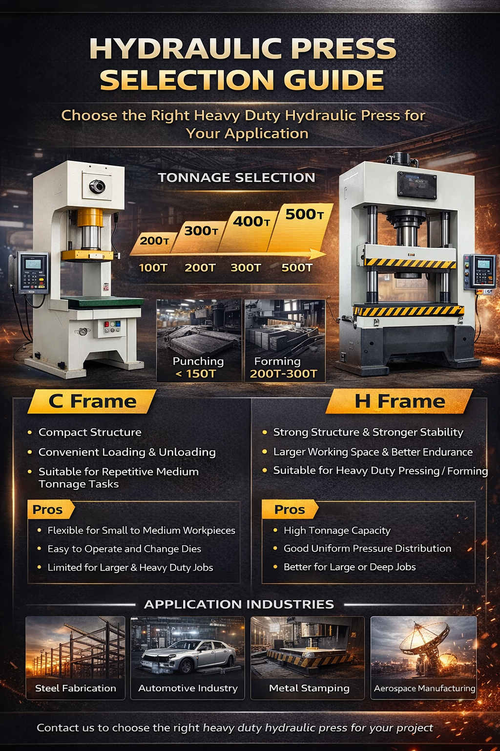 In this guide we will explain how to choose between H frame and C frame hydraulic press machines how to select the correct tonnage and what applications each type is best suited for.